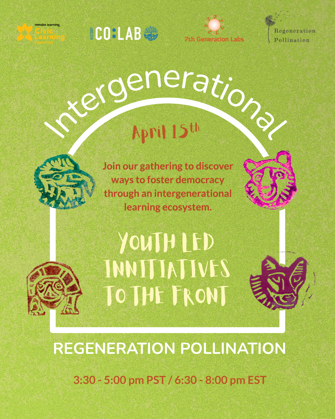 In this InterGenerational Regeneration Pollination, we bring together young people, educators, community leaders, and network builders to explore how cross-generational learning ecosystems can help renew democracy. Please share this invitation with young people in your life . . . they need to be seen, heard and valued at this unique moment in history.