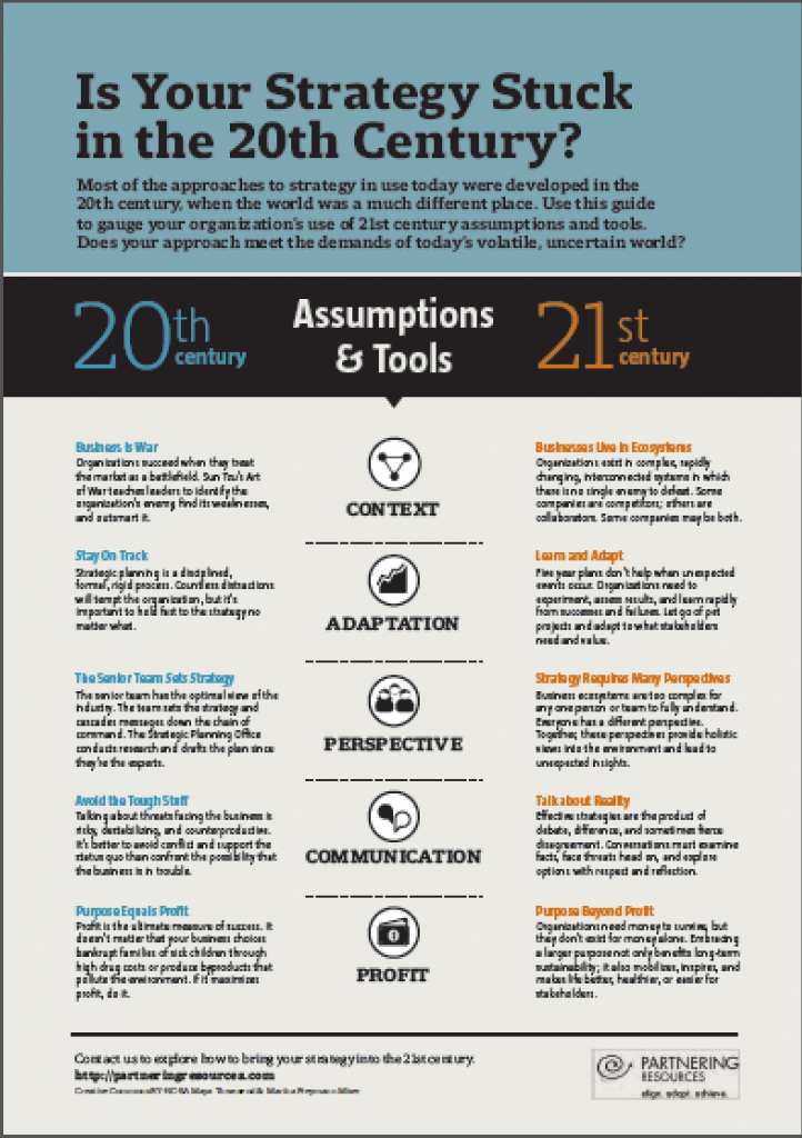 Gauge whether your organization uses tools designed for today’s volatile, uncertain world with the new infographic, “Is Your Strategy Stuck in 20th Century” co-created with Martha Freymann Miser of Aduro Consulting. Check to see: